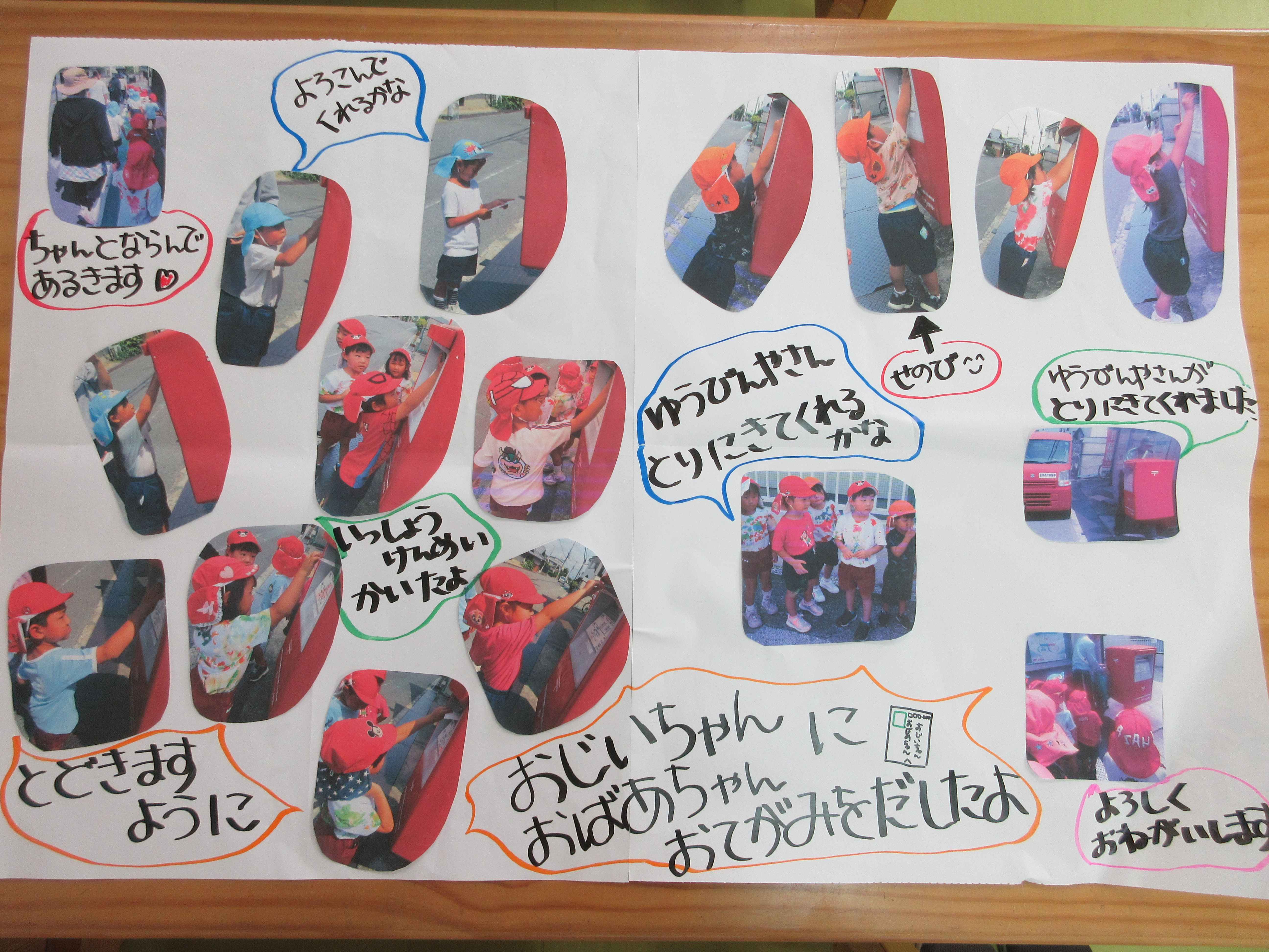 4歳児いちごぐみ、5歳児そらぐみのおともだち。手を後ろにしてなにか隠しているみたいですよ。。。