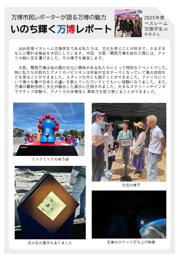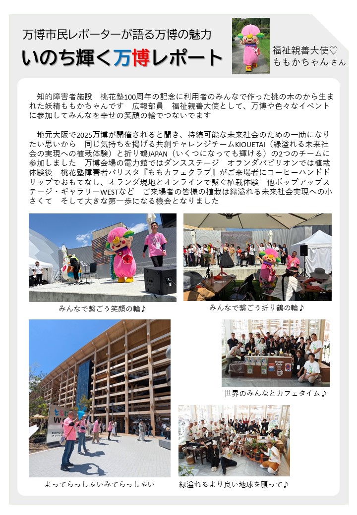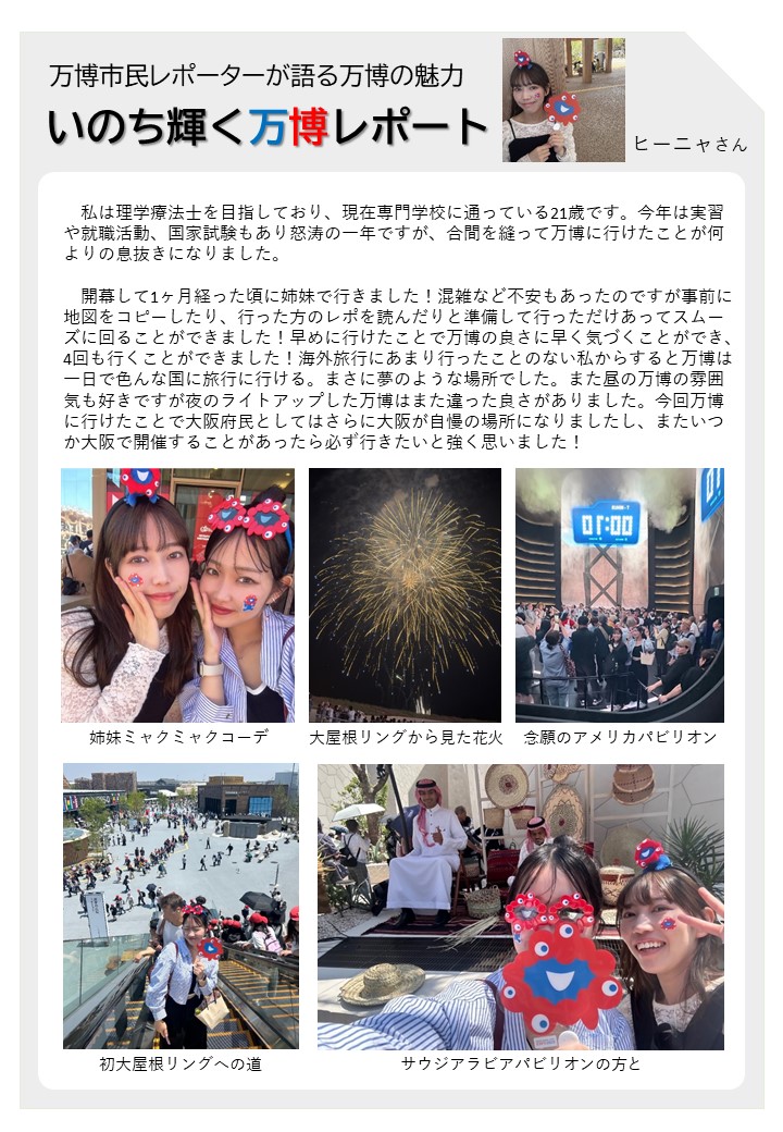 本市では、大阪・関西万博の開催期間中、市民の皆さんから、大阪・関西万博にかける思いや実際に会場へ行かれた体験談を写真とともにレポートしていただく「万博市民レポーター」を募集しました。