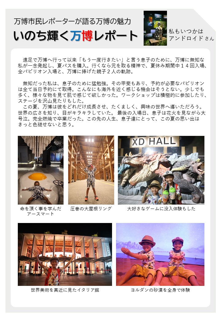 ここでは、万博市民レポーターの皆さんからご応募いただいた体験談や写真をご紹介します。