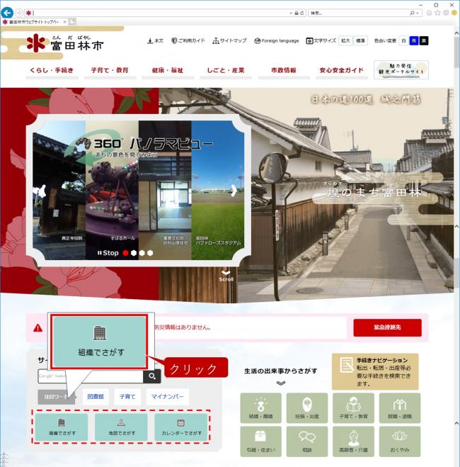 トップページの「組織でさがす」をクリックすると、富田林市の組織一覧ページが表示されます。