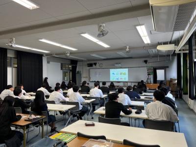 危機管理室職員より、「いのちと財産を守るー防災についてー」をテーマとして、防災の基礎知識や備蓄品についての講座を実施しました。学生さんが何気なく座っているベンチが、災害時に役立つ「かまど」として機能することや、災害被害を減らすためには、一人ひとりが自らの備えとして「自助力」を高め、「共助力」に繋げていく必要があるということをお話させていただきました。